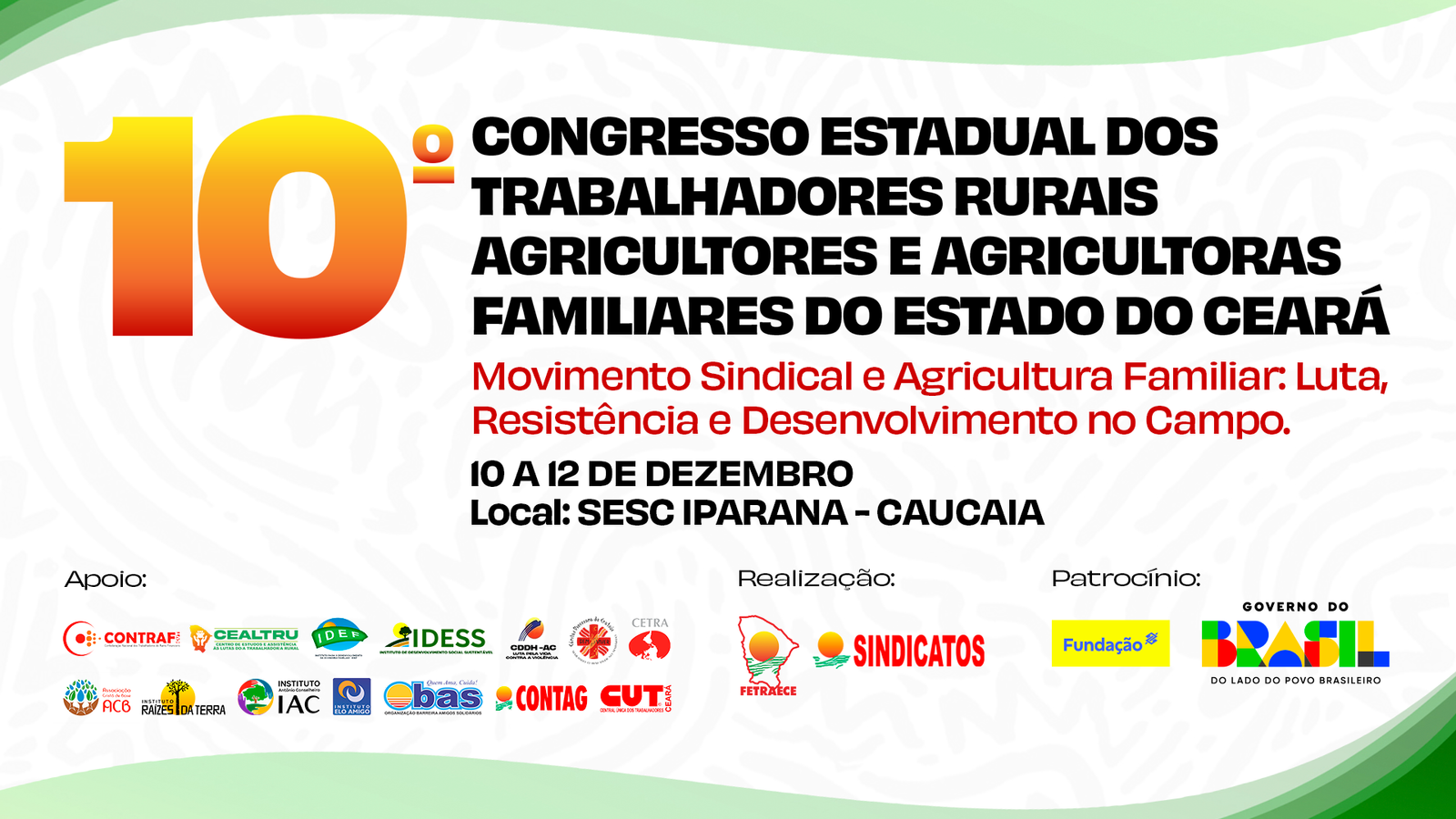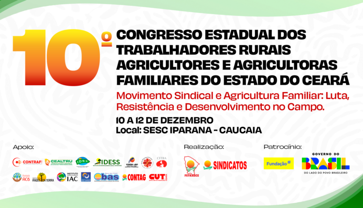 A Federação dos Trabalhadores Rurais Agricultores e Agricultoras Familiares do Estado do Ceará (FETRAECE) realiza, de 10 a 12 de dezembro de 2025, o 10º Congresso Estadual dos Trabalhadores e Trabalhadoras Rurais (10º CETTR). O evento que conta com patrocínio do Governo Federal e da Fundação Banco do Brasil (Fundação BB),acontecerá no Sesc Iparana Ecoresort, em Caucaia, e deve reunir cerca de 700 delegados e delegadas de sindicatos rurais de todas as regiões do estado.