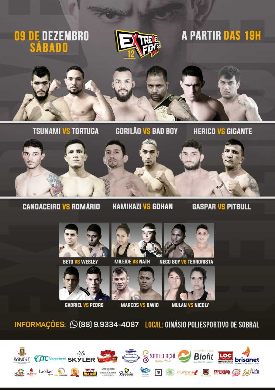 É grande a expectativa entre os fãs do MMA e das artes marciais para a 12ª edição do Extreme Fighter Sobral, que acontece no próximo sábado, 9 de dezembro, no Ginásio Poliesportivo Dr. Plínio Pompeu, a partir das 19h. Nessa edição, o card terá 12 combates, sendo uma luta de Jiu Jitsu, uma de Muay Thai e dez de MMA.