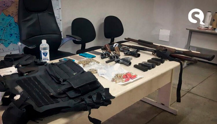 Com eles, foram apreendidos duas pistolas calibre .40, uma pistola calibre .380 e dois revólveres calibre .38, além de 127 munições dos calibres 38, .40 e 380, um carregador de pistola 380, dois coletes balísticos, cinco celulares, um tablet, uma televisão e uma maquineta de cartão.