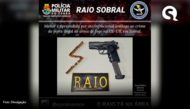 A Polícia Militar do Ceará, através das equipes da 1ª Companhia do 4ºBPRAIO, realizou a apreensão de uma menor pelo ato infracional análogo ao crime de porte ilegal de arma de fogo, quando a mesma se deslocava na Topic que faz linha Sobral a Groaíras.