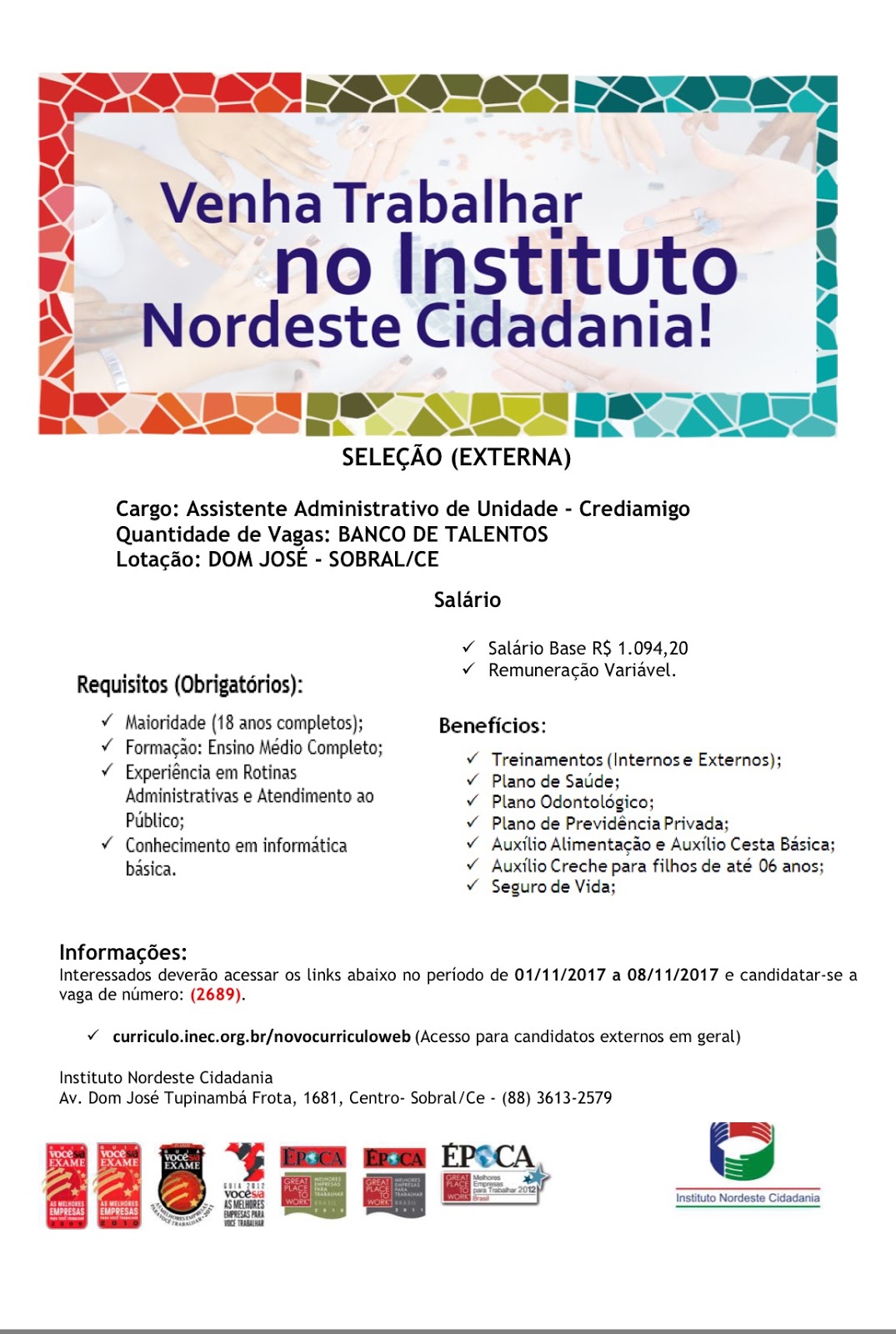 O Instituto Nordeste Cidadania (INEC), organização responsável por gerir os programas do Crediamigo e do Agroamigo do Banco do Nordeste está com seleção aberta para Assistente Administrativo de Unidade e Agente de Microcrédito Urbano em Sobral.