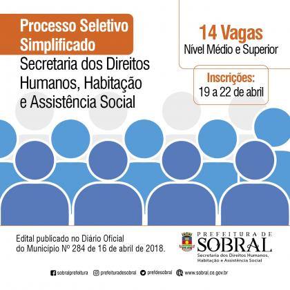 A Secretaria dos Direitos Humanos, Habitação e Assistência Social (Sedhas) está com processo seletivo aberto para contratação de profissionais de nível médio e superior. O edital foi publicado no Diário Oficial do Município na última segunda-feira (16). As inscrições serão online, e acontecem entre os dias 19 e 22 de abril.