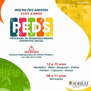 A Prefeitura de Sobral, por meio da Secretaria da Cultura, Juventude, Esporte e Lazer (Secjel), lança o Programa de Desenvolvimento Esportivo Social – PDES, envolvendo as modalidades de Basquete, Vôlei, Handebol, Futsal, Futebol, Capoeira e Dança para jovens de 12 à 15 anos e Recreação para crianças de 08 à 11 anos.
