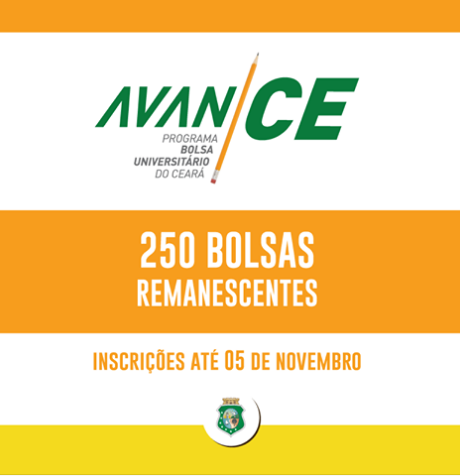 Estão abertas, até 05 de novembro, as inscrições para concessão de 250 bolsas remanescentes do Programa AvanCE – Bolsa Universitário, referentes ao ano de 2017. Os estudantes selecionados terão direito ao benefício mensal no valor de R$ 937,00, a ser concedido durante seis meses, ou R$ 468,50 no período de um ano. O objetivo é melhorar as condições de acesso à universidade dos estudantes egressos da rede pública cearense, por meio de auxílio financeiro.