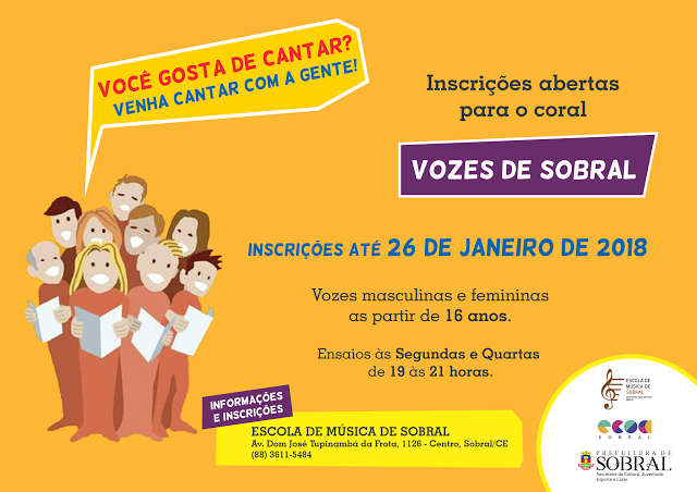 A Prefeitura de Sobral, por meio da Secretaria da Cultura, Juventude, Esporte e Lazer (Secjel), e Escola de Cultura, Comunicação, Ofícios e Artes (Ecoa), abre inscrições para o Coral Vozes de Sobral, que seleciona jovens a partir de 16 anos para compor o grupo que faz parte das práticas de conjunto da Escola de Música de Sobral – Maestro José Wilson Brasil.