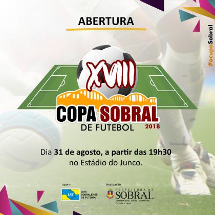 A Prefeitura de Sobral, por meio da Secretaria da Cultura, Juventude, Esporte e Lazer (Secjel), e a Liga Sobralense de Futebol realizam, nesta sexta-feira (31/08), a abertura da XVIII Copa Sobral de Futebol. O evento inicia a partir das 19h30min, no Estádio do Junco.