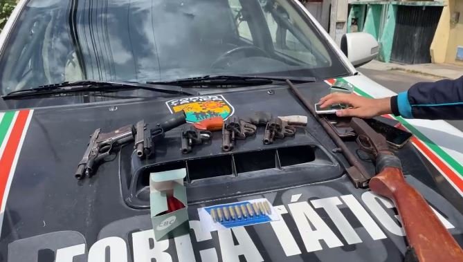 A Polícia Militar do Ceará (PMCE) apreendeu cinco armas de fogo, drogas e munições, durante ações distintas ocorridas de sexta-feira (07) para sábado (08), em Sobral, Cariré e Frecheirinha na Região Norte do Estado. Além disso, um mandado de prisão em aberto foi cumprido pelo crime de homicídio. Dois adultos e três adolescentes foram detidos em flagrante.