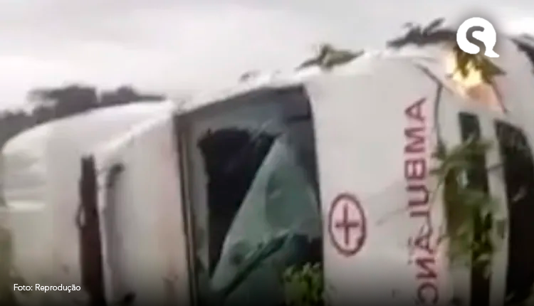 Ambulância com paciente sai da pista e tomba em dia de chuva em Tauá