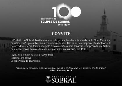 Nesta terça-feira (29/05), acontece a abertura do “Ano Municipal das Ciências” em Sobral, na Praça do Patrocínio, a partir das 19 horas. O evento marca o início da programação que antecede a comemoração dos 100 anos da comprovação da Teoria da Relatividade Geral (29 de maio de 2019), formulada pelo físico alemão Albert Einstein, comprovada em Sobral, pela observação do mais famoso eclipse solar da história, em 1919.