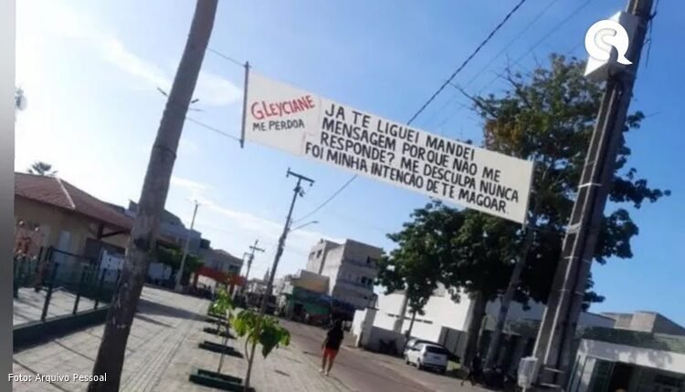 A faixa com o recado: “Gleyciane me perdoa. Já te liguei, mandei mensagem, por que não me responde? Me desculpa, nunca foi minha intenção de te magoar”, foi colocada na madrugada de quarta (18) para quinta-feira (19) e chamou atenção dos moradores do município com pouco mais de 27.800 habitantes.