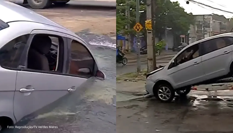 O asfalto da rua José Hipólito, no bairro Coaçu, em Fortaleza (CE), cedeu na manhã desta quarta-feira (28) e “engoliu” um carro que trafegava pelo local. O motorista, que trabalha como entregador de salgados, estava na região para realizar uma entrega quando o veículo afundou repentinamente na via.
