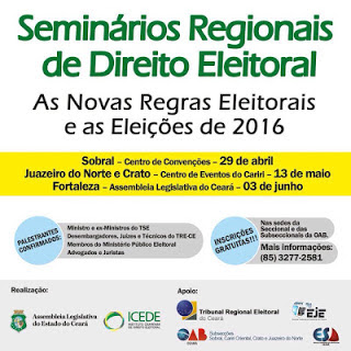 A Assembleia Legislativa do Estado do Ceará (ALCE) e o Instituto Cearense de Direito Eleitoral (Icede) realizarão os I, II e III Seminários Regionais de Direitos Eleitoral “As Novas Regras Eleitorais e as Eleições de 2016”, nas cidades de Sobral, de Juazeiro do Norte – Crato e Fortaleza. Os Seminários contam com o apoio do Tribunal Regional Eleitoral do Ceará (TRE/CE) e da Escola Judiciária Eleitoral do Ceará (EJE/CE) e também da OAB Ceará; e das suas subseccionais de Sobral, Serra da Ibiapaba, de Iguatu, do Cariri Oriental, do Crato e de Juazeiro do Norte e da Escola Superior de Advocacia – ESA Ceará.