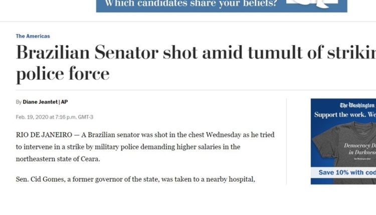 O jornal norte-americano “The Washington Post” publicou, em sua edição digital, a notícia de que o parlamentar cearense “foi baleado no peito enquanto tentava intervir em uma greve de militares por reajuste salarial” e depois o ex-governador do Ceará foi hospitalizado.