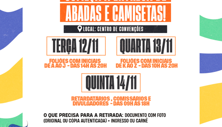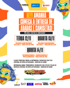 Os foliões do CarnaSobral 2024 já podem se preparar: a entrega dos abadás e camisas acontece a partir desta terça-feira (12), no Centro de Convenções de Sobral. Confira o cronograma de distribuição, que varia conforme a inicial do nome do participante: