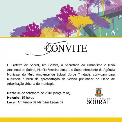 A Prefeitura de Sobral, por meio da Secretaria do Urbanismo e Meio Ambiente e Agência Municipal do Meio Ambiente (AMA), realiza, nesta terça-feira (04/09), uma audiência pública para apresentação da versão preliminar do Plano de Arborização Urbana de Sobral, no anfiteatro da Margem Esquerda, a partir das 19 horas.