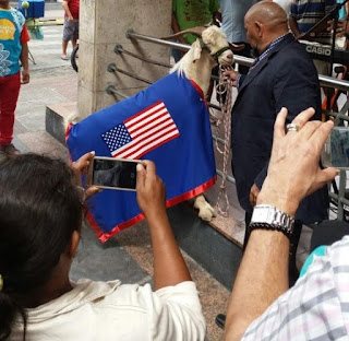 Muitas pessoas aproveitaram a oportunidade para tirar fotos com o Bode Trump. Afinal, vai que ele vira uma celebridade não é mesmo?