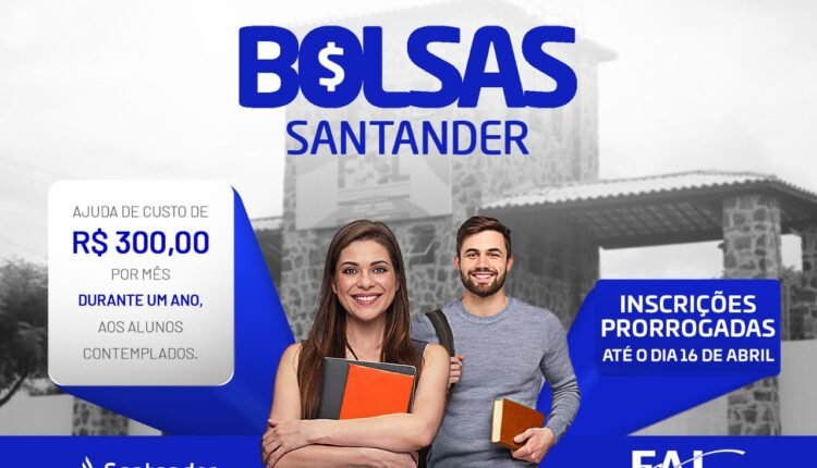 A Faculdade Alencarina de Sobral (FAL), em parceria com o Programa Santander Graduação, comunica que foram prorrogadas as inscrições para a seleção que contemplará com bolsas em dinheiro os acadêmicos selecionados. O Programa tem como objetivo contribuir, através de apoio financeiro, para que estudantes de instituições de ensino superior tenham a oportunidade de dar continuidade aos estudos, incrementando a qualidade da formação acadêmica. As inscrições seguem até sexta-feira (16) e são realizadas no site oficial do banco, no link https://www.becas-santander.com/pt-BR/program/graduacao2021.