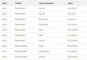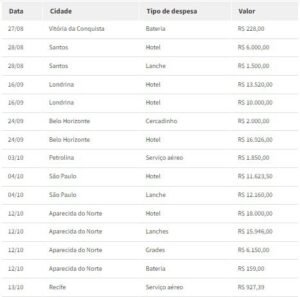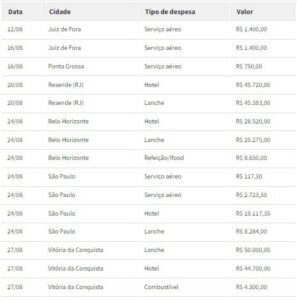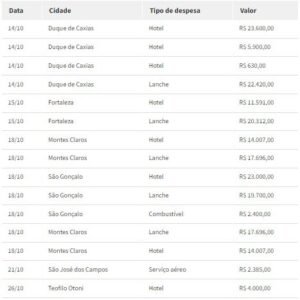 Entre as despesas, estão R$ 18 mil com hotel e R$ 15.946,80 com lanches.