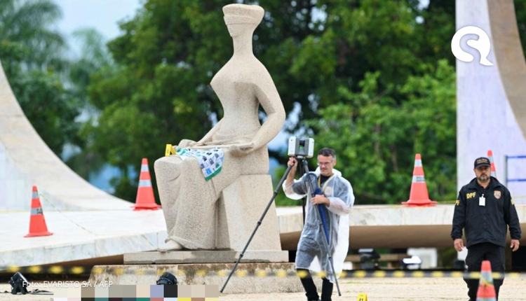 “Debora Rodrigues, por favor não desperdice batom! Isso é para deixar as mulheres bonitas! Estátua de merda (sic) se usa TNT [um explosivo]”, diz o escrito no espelho. Débora é uma das pessoas presas pelos atos de 8 de janeiro, que foi flagrada pichando a estátua do STF.