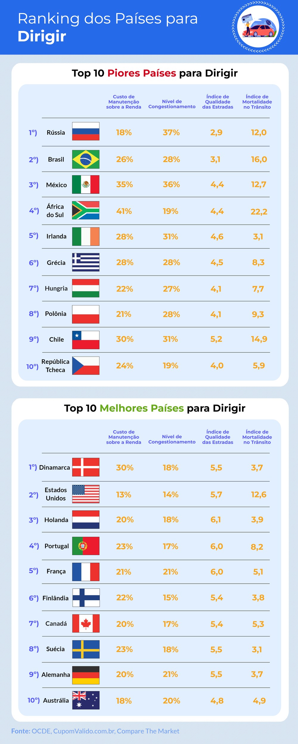 Para a elaboração do ranking, foram considerados quatro fatores: o custo de manutenção dos veículos em relação a renda dos residentes do país, o nível de congestionamento, o índice de qualidade das estradas e o de mortalidade no trânsito.