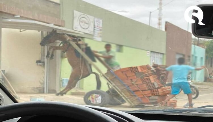Um burro ficou suspenso em uma carroça com excesso de peso no Bairro Salesianos, em Juazeiro do Norte, ocaso ocorreu na manhã desta terça-feira (27), foi fotografado e denunciado à polícia ambiental. Uma equipe do Batalhão de Polícia do Meio Ambiente de Juazeiro do Norte constatou que o animal transportava uma carga pesada de tijolos.
