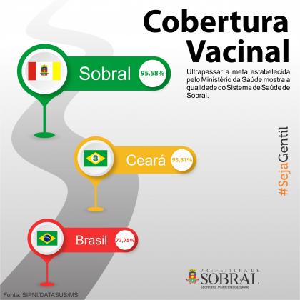 De acordo com o Sistema de Informação do Programa Nacional de Imunização (SI-PNI), o município de Sobral já imunizou 95,58%, uma porcentagem que corresponde em números absolutos a 41.189 sobralenses, pertencentes aos grupos prioritários formados por idosos, crianças, gestantes, indígenas, pessoas com doenças crônicas e profissionais da saúde. O município continua superando a média nacional e estadual.