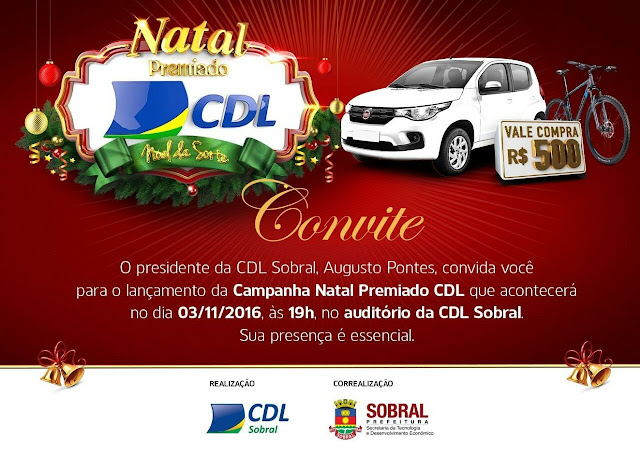 Para fortalecer o comércio e estimular as compras de final de ano, a Câmara de Dirigentes Lojistas (CDL) de Sobral , em parceria com a Prefeitura Municipal, por meio da Secretaria da Tecnologia e Desenvolvimento Econômico (STDE), lança nesta quinta-feira (3), às 19h, no Auditório da CDL de Sobral, a ‘Campanha Natal Premiado CDL 2016 – Noel dá Sorte’.