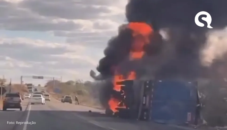 Um acidente foi registrado na BR-020, no interior do Ceará, onde uma carreta tombou e pegou fogo. A ocorrência se deu na tarde desta quinta-feira (12), na entrada do município de Canindé, no Sertão Central. Após o ocorrido, podia-se ver uma nuvem espessa de fumaça escura subindo ao céu, com o veículo tombado na lateral da pista. Parte do tráfego no trecho teve que ser interditado.