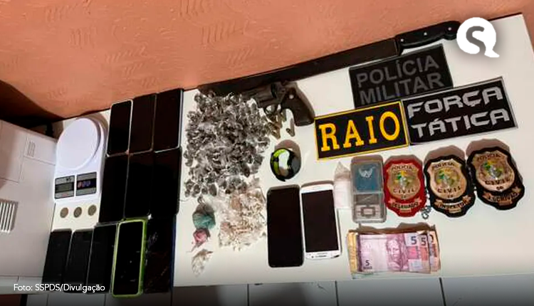 Com ele, os policiais apreenderam um adolescente de 16 anos envolvido no crime de tráfico de drogas. Também foi encontrado um revólver com munição, uma balança de precisão, dinheiro, cocaína, crack e maconha.