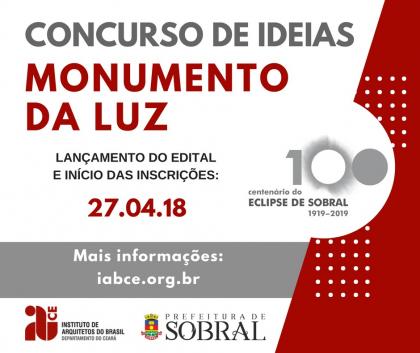 A Prefeitura de Sobral, por meio da Secretaria do Urbanismo e Meio Ambiente, lançou, na última sexta-feira (20), o concurso público de ideias para o projeto de monumento arquitetônico comemorativo dos 100 anos da comprovação da teoria da relatividade em Sobral. As inscrições serão online e acontecem de 27 de abril a 11 de junho. Os resultados das propostas serão divulgados dia 25 de junho.
