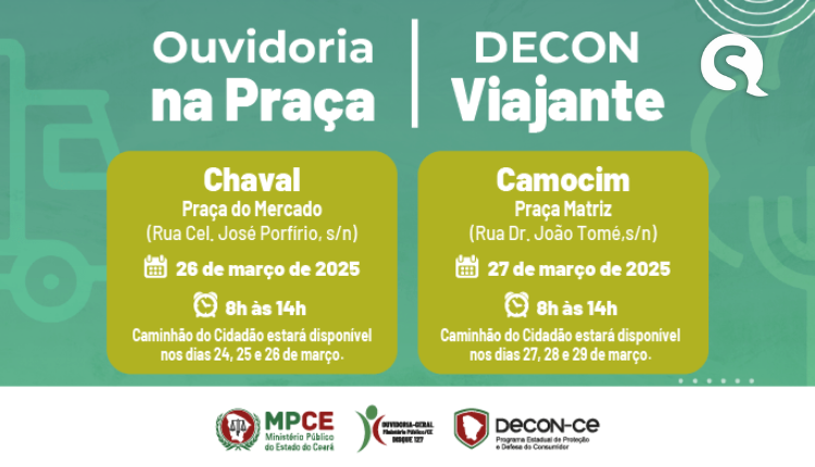 Chaval e Camocim receberão serviços dos projetos Ouvidoria na Praça e Decon Viajante do MP do Ceará nos dias 26 e 27 de março