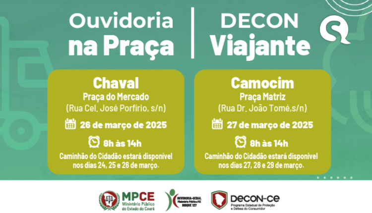 O Ministério Público do Estado do Ceará levará para os municípios de Chaval e Camocim mais uma edição dos projetos Ouvidoria na Praça e Decon Viajante nos dias 26 e 27 deste mês, respectivamente. As ações, que ocorrerão das 8h às 14h, levarão informações sobre as atribuições do MP e de suas unidades ministeriais especializadas, além de atendimento ao consumidor, prestação de serviços assistenciais e cuidados com a saúde.