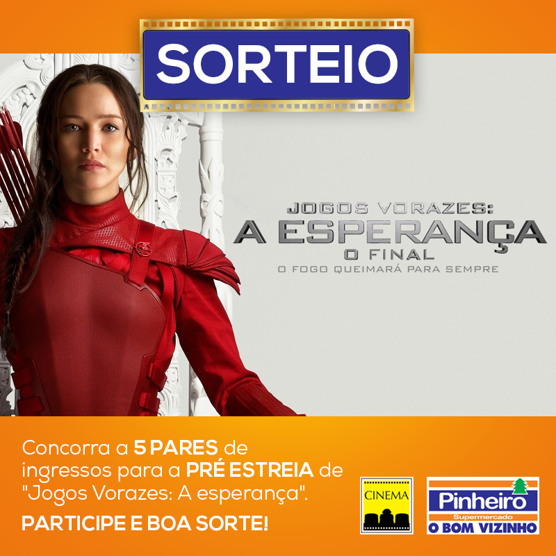 O Pinheiro Supermercado realiza, em todos os cinemas da rede, a pré-estreia nacional do filme “Jogos Vorazes: A Esperança – O final”, nesta quarta-feira (18). O capítulo que encerra a franquia será lançado na quinta-feira (19), em todo o Brasil. E para que mais pessoas possam conferir em primeira mão a exibição do longa na quarta-feira, o supermercado lançou uma promoção nesta segunda-feira (16), em seu instagram.