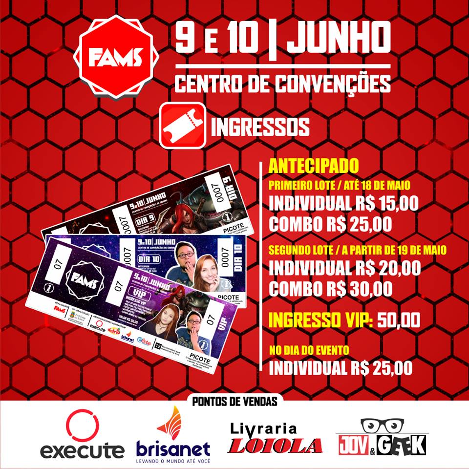 Já começaram as vendas dos ingressos do Festival Anime e Mangá de Sobral – FAMS 2018, que acontece nos dias 9 e 10 de junho, no Centro de Convenções de Sobral. Aproveitem o primeiro lote que é mais barato. Nesse grupo estarão 80 ingressos vips que dão vantagens diferenciadas, tais como,