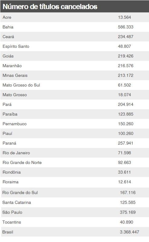 Os dados do TSE mostram que 45% dos títulos cancelados (1,5 milhão) são de eleitores em sete Estados nordestinos, sendo 586 mil apenas na Bahia, onde Haddad aparece com 33% de preferência na pesquisa Datafolha. Jair Bolsonaro (PSL), que em todo o Brasil lidera as pesquisas, tem 14% de intenção de voto entre os baianos.