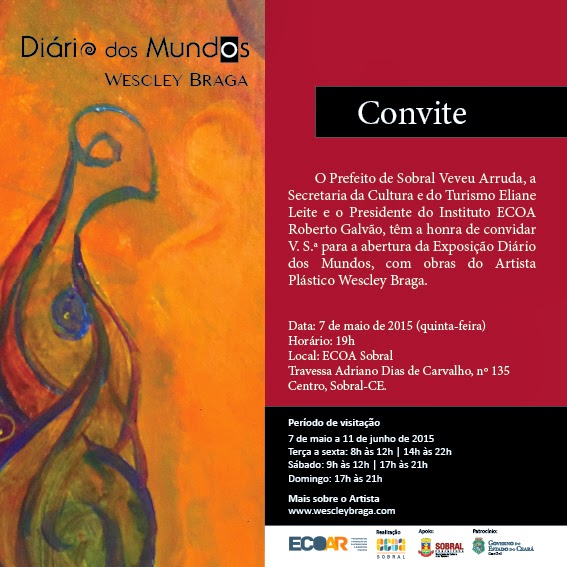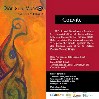 O artista plástico Wescley Braga está dando os retoques finais nos preparativos para abertura da exposição ‘Diário dos Mundos’, que trará a Sobral. Um acervo de 78 de suas obras. A abertura da exposição, que terá curadoria de Roberto Galvão, acontece no próximo dia 7 de maio, às 19h no Instituto ECOA, em Sobral-Ce, ficando em mostra até o dia 11 de junho de 2015.