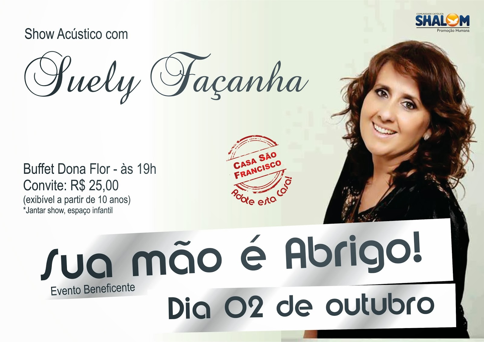 O jantar “Sua Mão é Abrigo” terá como atração a cantora da Comunidade Shalom de Fortaleza, Suely Façanha, que fará um show acústico cantando clássicos que marcaram sua história e músicas do seu mais novo CD intitulado “Vou viver pela fé”. A artista católica foi uma das que se apresentaram ao Papa Francisco durante a Jornada Mundial da Juventude, realizada no Rio de Janeiro.