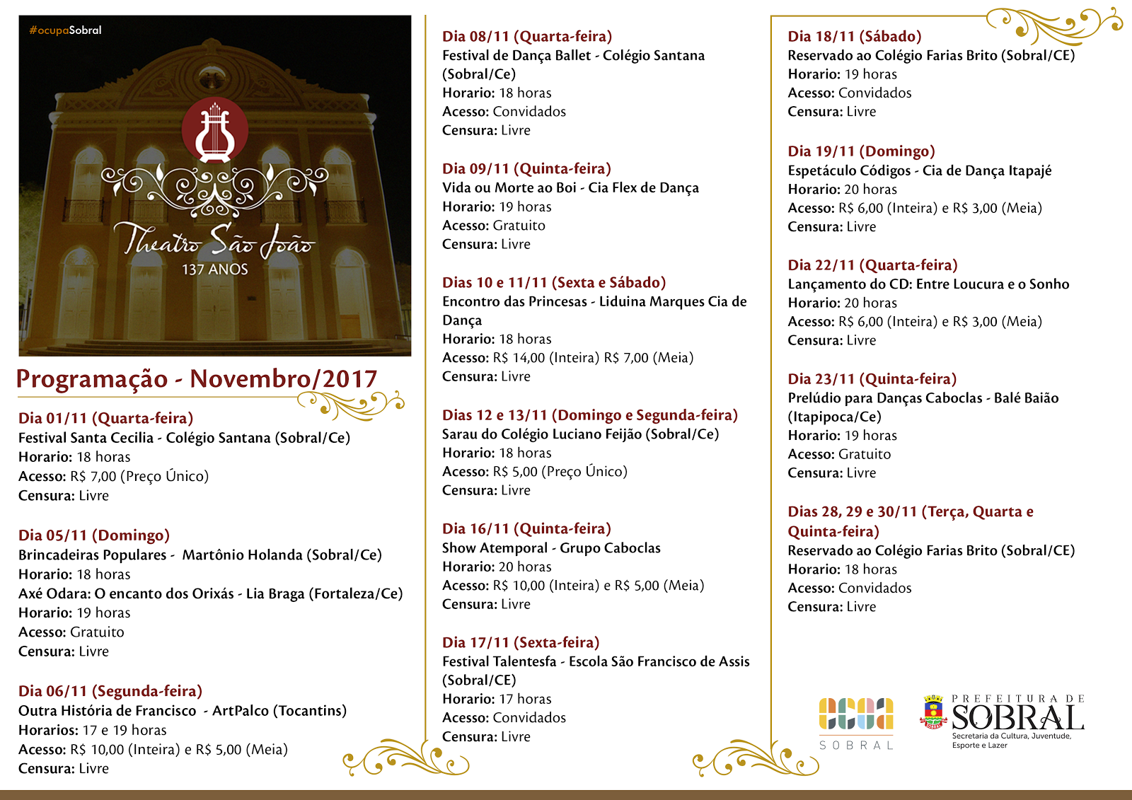 Com diversas atividades culturais realizadas de terça a domingo, o Theatro São João vem agitando o circuito cultural de Sobral e promete animar ainda mais a cidade com a nova programação de peças e musicais. De 1º a 30 de novembro, artistas locais e regionais, selecionados via Edital de Ocupação, farão apresentações com atividades nas linguagens da música, teatro, dança e programação infantil.