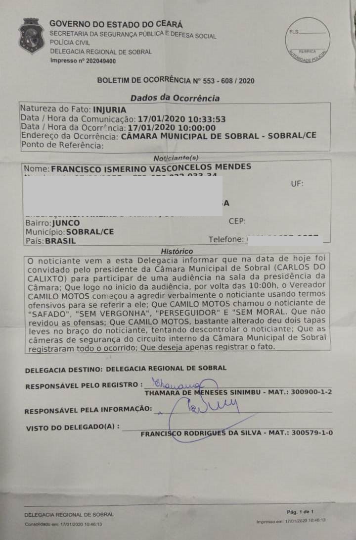 Ainda segundo o B.O, Camilo, “bastante alterado”, “deu dois tapas leves no braço do noticiante, tentando descontrolar o noticiante”.