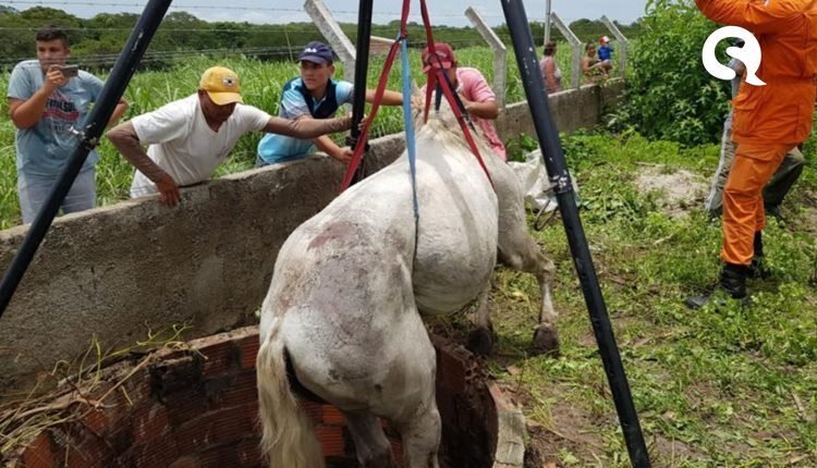 O Corpo de Bombeiros Militar do Ceará (CBMCE) resgatou um cavalo de 250 kg que caiu em uma cacimba de aproximadamente 3 metros de profundidade, em Itapipoca, na localidade de Macaco, na manhã dessa segunda-feira, 7. Segundo o tutor do animal, ele estava desaparecido desde a noite de domingo, 6.