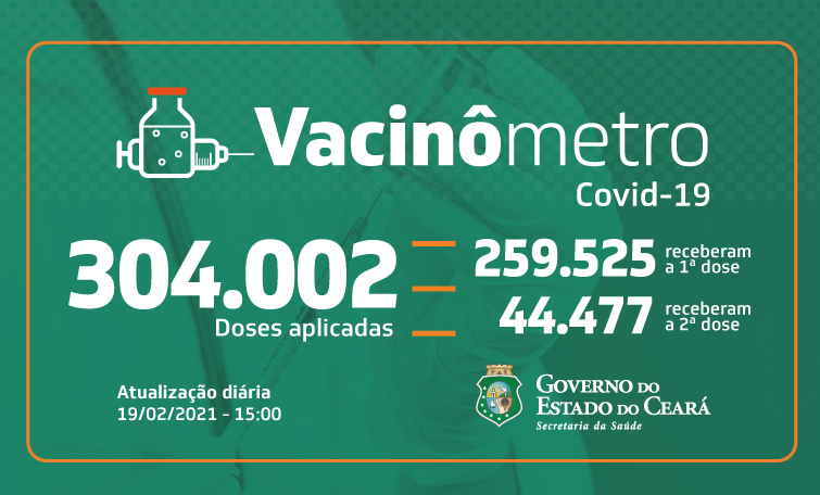 O estado do Ceará já tem 304.002 pessoas vacinadas contra a Covid-19. Balanço divulgado na tarde desta sexta-feira (19) pela Secretaria da Saúde do Estado (Sesa) mostra ainda que três cidades já aplicaram 100% das doses disponíveis para a primeira fase do grupo prioritário de vacinação.