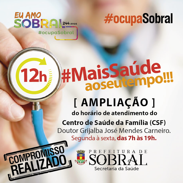 A partir desta quinta-feira (20/07), a Prefeitura de Sobral, por meio da Secretaria da Saúde, ampliará o horário de atendimento do Centro de Saúde da Família (CSF) Doutor Grijalba José Mendes Carneiro, no bairro Coelce. O equipamento passará a funcionar de segunda à sexta, das 7h às 19h. Este é o primeiro atendimento ampliado da atenção básica de Sobral e é mais um dos compromissos de campanha do prefeito Ivo Gomes.