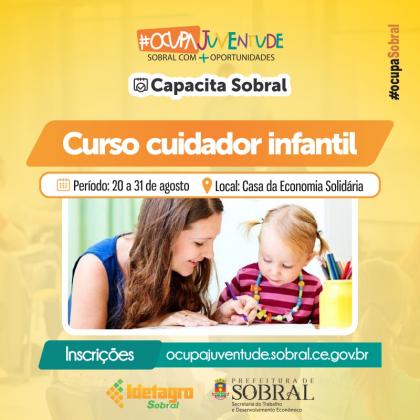 A Prefeitura de Sobral, por meio da Secretaria da Educação, abre as inscrições para o curso de cuidador infantil, como parte das ações do projeto “Capacita Sobral”, no âmbito do programa #ocupaJuventude. São oferecidas 20 vagas para profissionais que atuam nos Centros de Educação Infantil e escolas municipais. A carga horária total é de 40 horas/aulas.