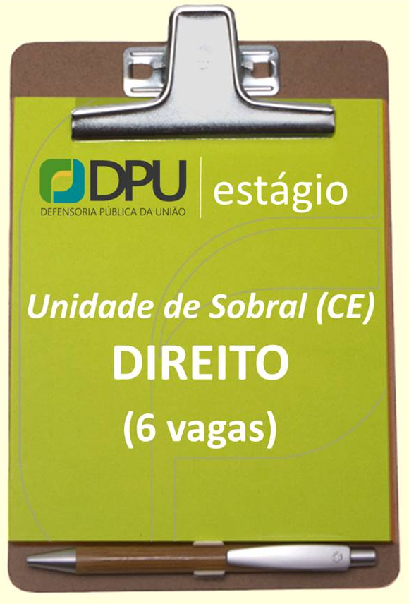 A Defensoria Pública da União está com inscrições abertas, no período de 13 a 24 de junho, para preenchimento de 6 (seis) vagas de estágio para estudantes de Direito na unidade de Sobral. A inscrição está disponível no sítio do CIEE (AQUI). Clique AQUI e confira o edital
