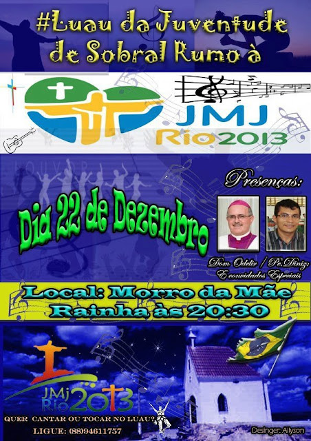 Hoje (22) a Diocese de Sobral estará realizando o LUAL DA JUVENTUDE no morro da MÃE RAINHA!!! RUMO A Jornada Mundial da Juventude com o Papa Bento XVI – (JMJ 2013) Na ocasião terá momentos de louvor e adoração para toda a juventude católica de Sobral.