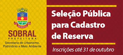 Estão abertas, até o dia 31 de outubro, as inscrições de candidatos à Seleção Pública para formação de cadastro de reserva do quadro de contratados da Secretaria de Urbanismo, Patrimônio e Meio Ambiente de Sobral (SEURB). Serão selecionados profissionais de nível superior, nas áreas de Arquitetura, Engenharia Civil e Tecnologia da Construção Civil para o cargo de Agente de Obras/ Analista e, de nível médio, para o cargo de Agente de Posturas.