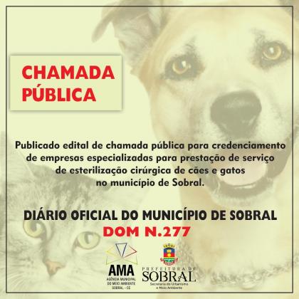 A Prefeitura de Sobral, por intermédio da Agência Municipal de Meio Ambiente (AMA), divulga o edital de chamada pública para credenciamento de empresas especializadas para prestação de serviços de esterilização cirúrgica de cães e gatos, com o objetivo de atender a demanda de controle populacional e identificação desses animais, através de um programa de castração gratuita. O edital, aberto dia 05 de abril, tem vigência de um ano.
