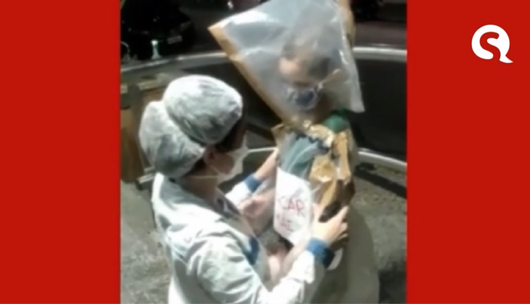 Gabriel, de 4 anos, aguardou a mãe na entrada da unidade de saúde coberto com o “saco do abraço” e placa com o pedido “mamãe vem me abraçar”. Ao ver o filho, Tayara Moraes se emocionou e foi ao encontro da criança. O momento foi acompanhado por funcionários e pessoas que estavam na unidade de saúde.