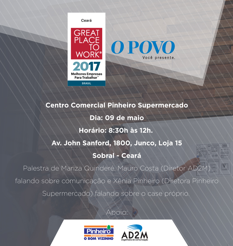Um ambiente de trabalho saudável, harmonioso, que motive e proporcione oportunidade de crescimento à equipe é o sonho de todo trabalhador e, cada vez mais, cenário indispensável para o sucesso e sustentabilidade de qualquer negócio. Visando premiar as melhores empresas para trabalhar e incentivar outras empresas a também adotarem medidas que estimulem e valorizem os colaboradores, o Great Place To Work (GPTW) – empresa pioneira em conduzir pesquisas para definição de excelentes ambientes de trabalho – criou o Prêmio Melhores Empresas para Trabalhar (Mept), realizado em diversos países e a nível nacional e estadual. No Ceará, o Prêmio é realizado em parceria com o Grupo O POVO de Comunicação. Na próxima terça-feira (9), a diretora do GPTW no estado, Mariza Quinderé, juntamente com o Pinheiro Supermercado, eleito a Melhor Empresa para Trabalhar no Ceará em 2016, e a AD2M Engenharia de Comunicação, realizarão um café da manhã, a partir das 9 horas, no Cine Renato Aragão, no Pinheiro Supermercado do bairro Junco, em Sobral, com empresários, empreendedores e gestores da cidade e região para explicar em que consiste o Prêmio, como participar e para falar da edição de 2017.