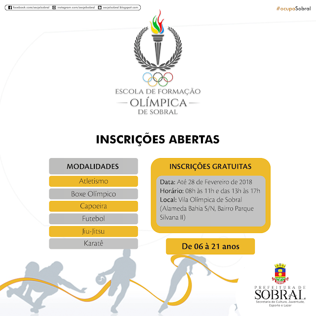 A Prefeitura de Sobral, por meio da Secretaria da Cultura, Juventude, Esporte e Lazer (Secjel) e Secretaria Municipal da Educação (SME), abre inscrições para as formações esportivas modalidades nas modalidades de Atletismo, Box Olímpico, Capoeira, Futebol, Jiu Jitsu e Karatê da Escola de Formação Olímpica (Esfo). As formações têm foco nas faixas etárias de 06 a 21 anos de idade.